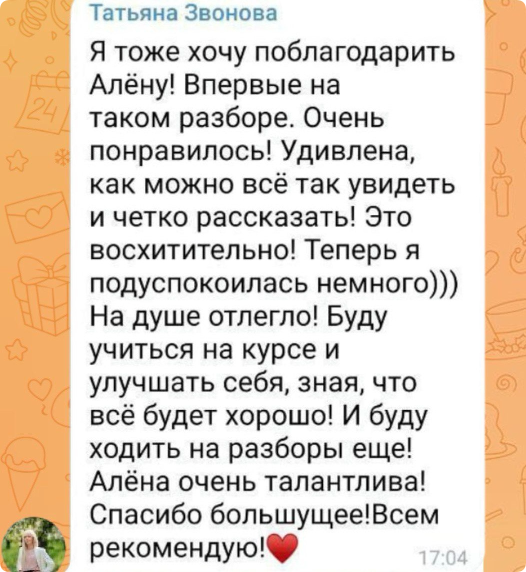Учитывая, что консультация Алены стоит 20 000 руб, получить подобный разбор -- невероятная возможность!