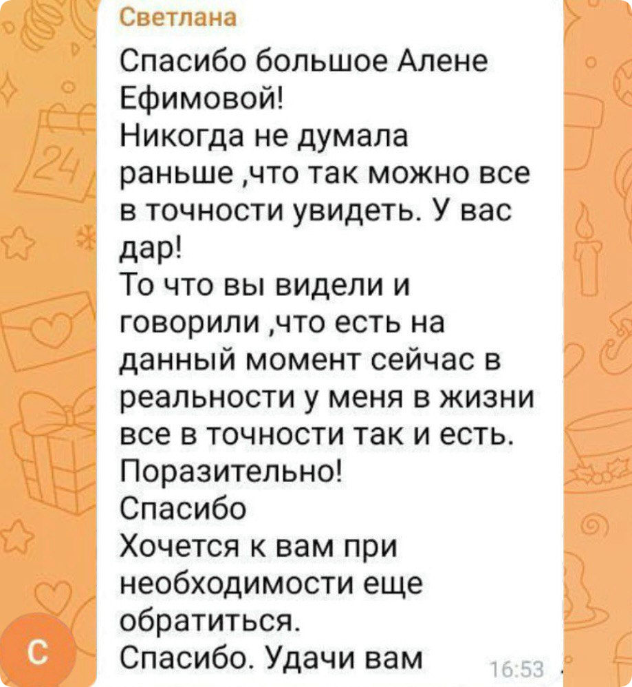 Алена делает разборы глубоко и качественно, используя методы предсказания, расстановок и психотерапии. Все девушки получают состояние полной ясности, спокойствия и понимания, что делать дальше.