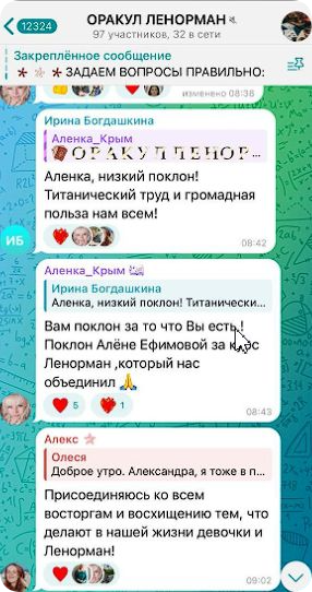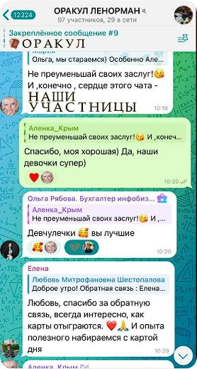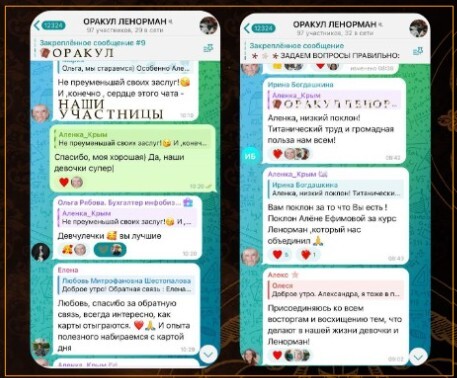 В программе "Оракул Ленорман" есть 2 локации: личный кабинет для обучения и телеграмм чат для общения.