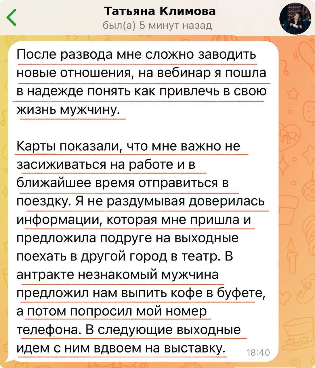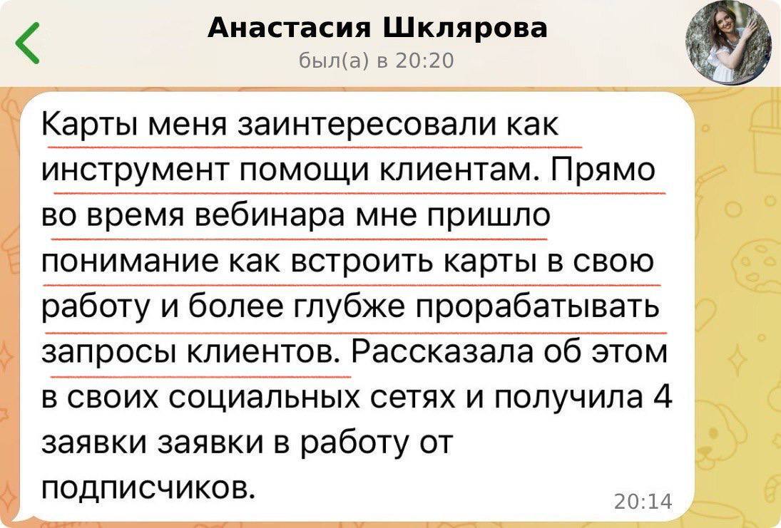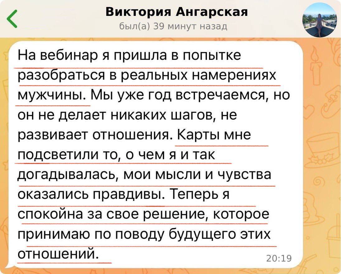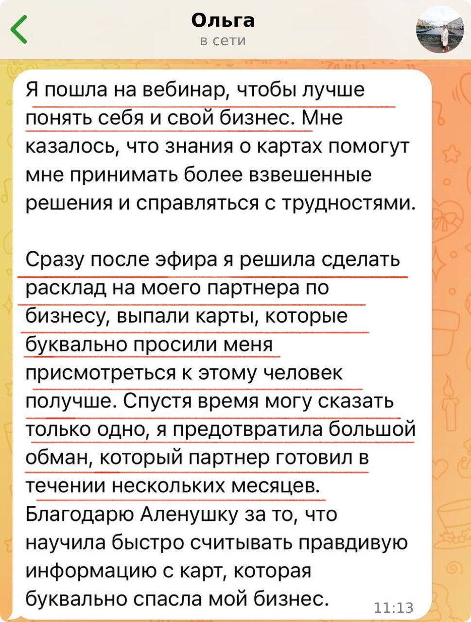 После вебинара сделала расклад на котором увидела истинные намерения партнера, благодаря этой информации смогла спасти свой бизнес.